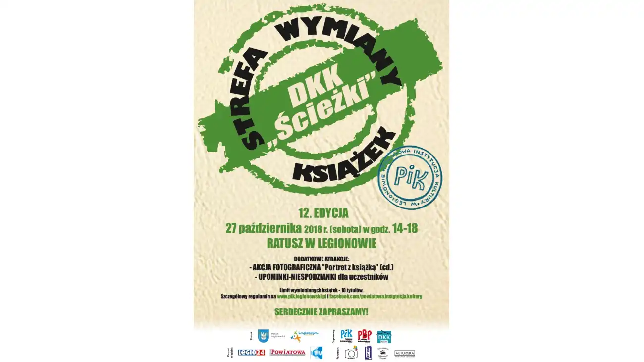 Już w najbliższą sobotę - 27 października br. w godzinach 14.00 – 18.00 w Ratuszu w Legionowie przy ul. Piłsudskiego 41 odbędzie się już 12 edycja Strefy Wymiany Książek.