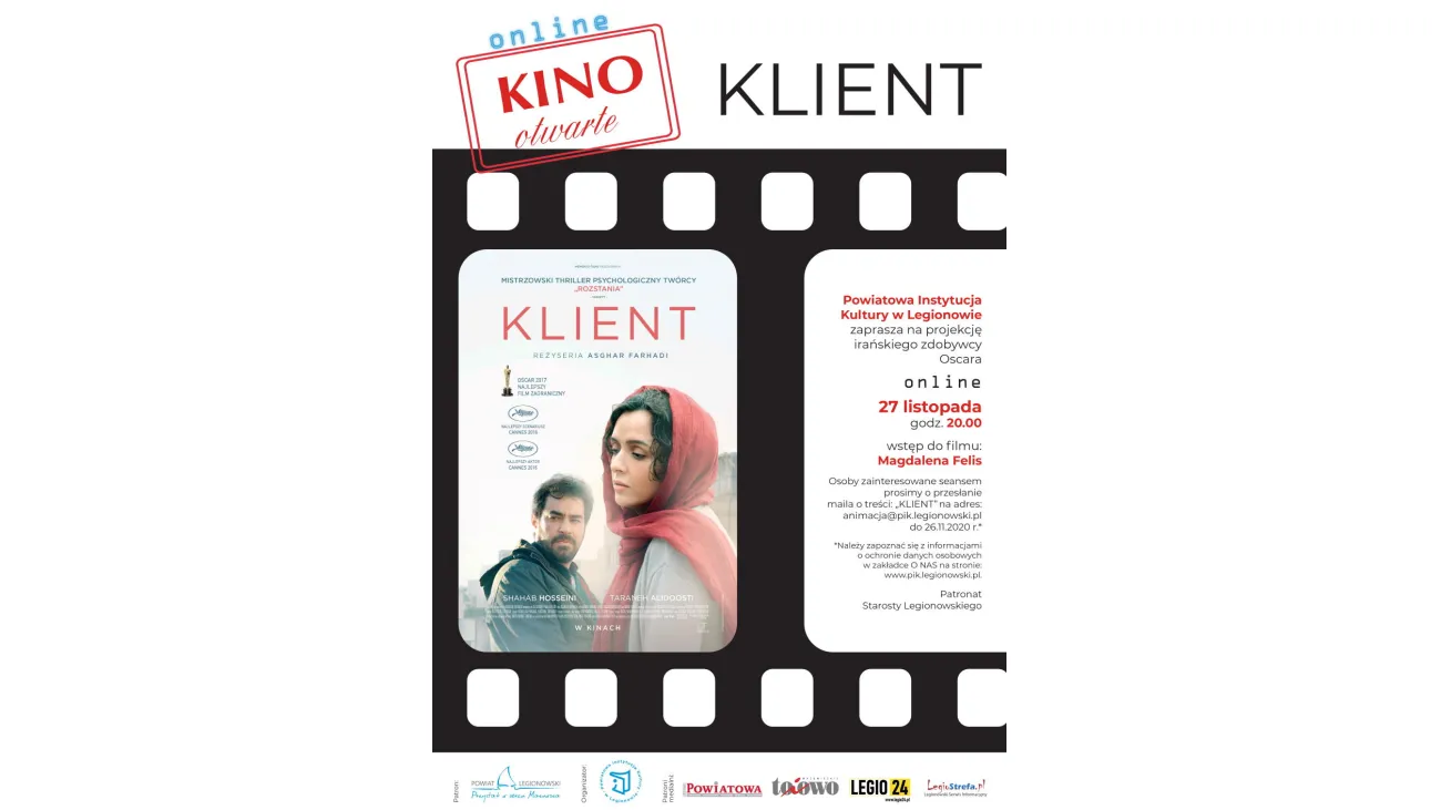 Osoby zainteresowane obejrzeniem filmu prosimy o przesłanie maila o treści: "KLIENT" na adres: [email protected] do 26.11.2020 r. Seans jest bezpłatny, jednak liczba widzów ograniczona. (Przed wysłaniem maila należy zapoznać się z informacjami o ochronie danych osobowych w zakładce O NAS: https://pik.legionowski.pl/m-onas/m-pik/informacja-rodo.html)