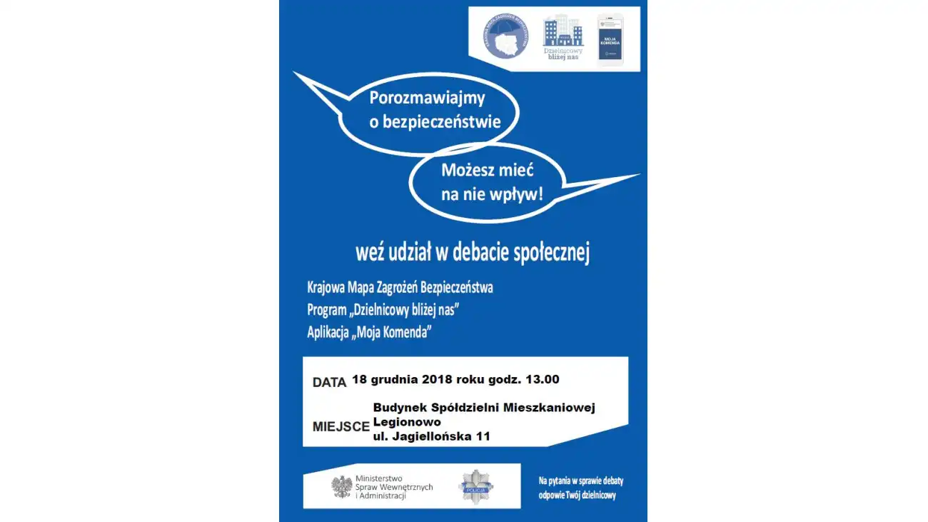 Zapraszamy mieszkańców Legionowa na debatę społeczną - mówi w imieniu Komendy st. asp. Justyna Stopińska. Debaty społeczne organizowane są przez legionowską komendę od 2012 roku. Policjanci organizują takie spotkania w całym powiecie, po to aby dotrzeć bezpośrednio do wszystkich mieszkańców poszczególnych miast i gmin. Debata społeczna ma na celu między innymi włączenie obywateli w wypracowywanie propozycji rozwiązań zmierzających do wzrostu poczucia bezpieczeństwa mieszkańców w środowisku lokalnym.