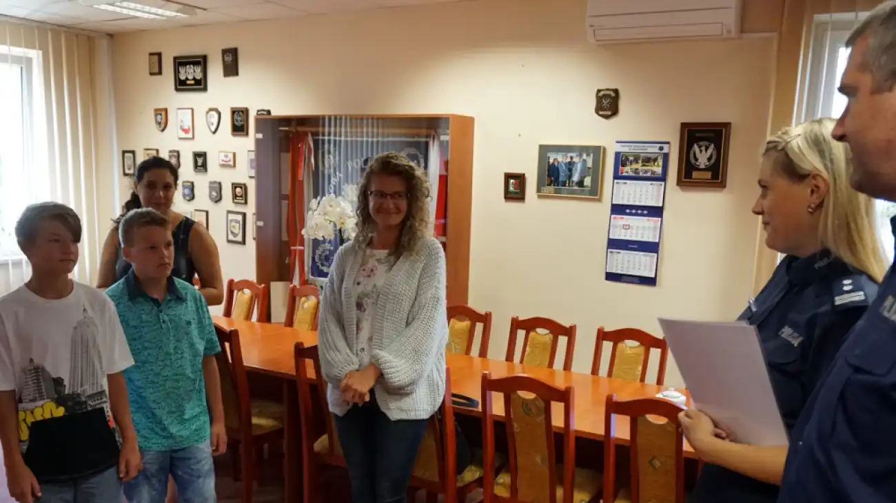 Postawa chłopców została też dostrzeżona przez legionowskich stróżów prawa. Dzisiaj, tuż po godzinie 10, ale jeszcze przed lekcjami w szkole, w legionowskiej komendzie ponownie pojawili się uczciwi znalazcy w towarzystwie swoich mam oraz siostry jednego z nich. Szymon Machnio oraz Mateusz Siporski od Komendanta Powiatowego Policji w Legionowie mł.insp. Anny Jędrzejewskiej-Szpak oraz p.o. Naczelnika Wydziału Prewencji asp.szt. Roberta Tabora, odebrali gratulacje i drobne upominki oraz pisemne podziękowania z wyrazami uznania dla ich postawy, w których możemy przeczytać m.in „…Uczciwe zachowanie oraz chęć bezinteresownej pomocy drugiemu człowiekowi zasługuje na wyróżnienie i pochwałę.”. Gratulacje odebrały też mamy obu chłopców, które były dumne z zachowania swoich synów. Podczas wizyty goście mieli też okazję do zwiedzenia legionowskiej komendy i zapoznania się z funkcjonowaniem monitoringu miejskiego.