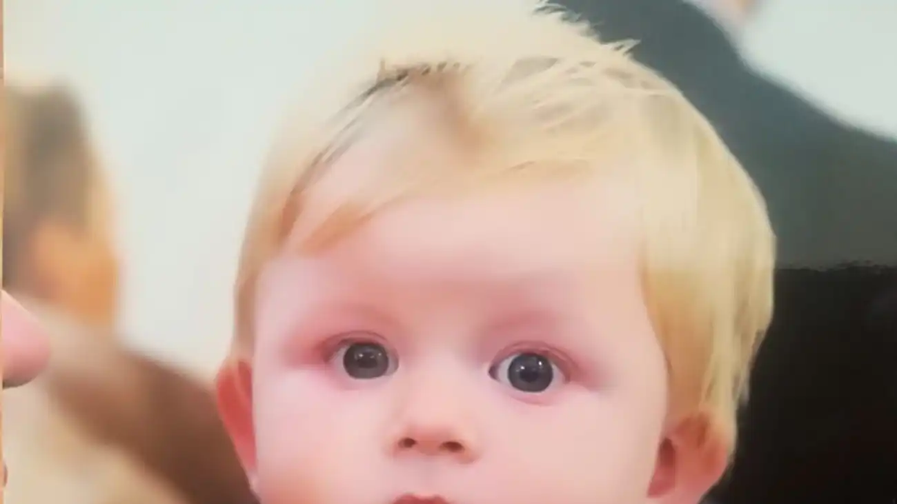 Chłopiec na około 90 cm wzrostu, otyłą budowę ciała, włosy krótkie blond, oczy koloru niebieskiego.
