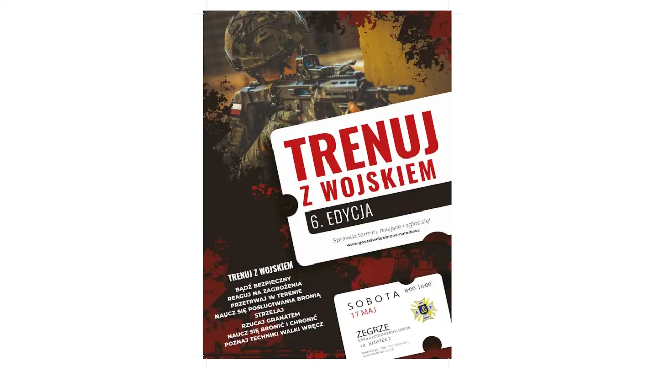 Ministerstwo Obrony Narodowej zaprasza na kolejną edycję projektu „Trenuj z Wojskiem”! Już 17 maja w Szkole Podoficerskiej SONDA w Zegrzu odbędzie się bezpłatne, ośmiogodzinne szkolenie wojskowe, prowadzone przez doświadczonych instruktorów.