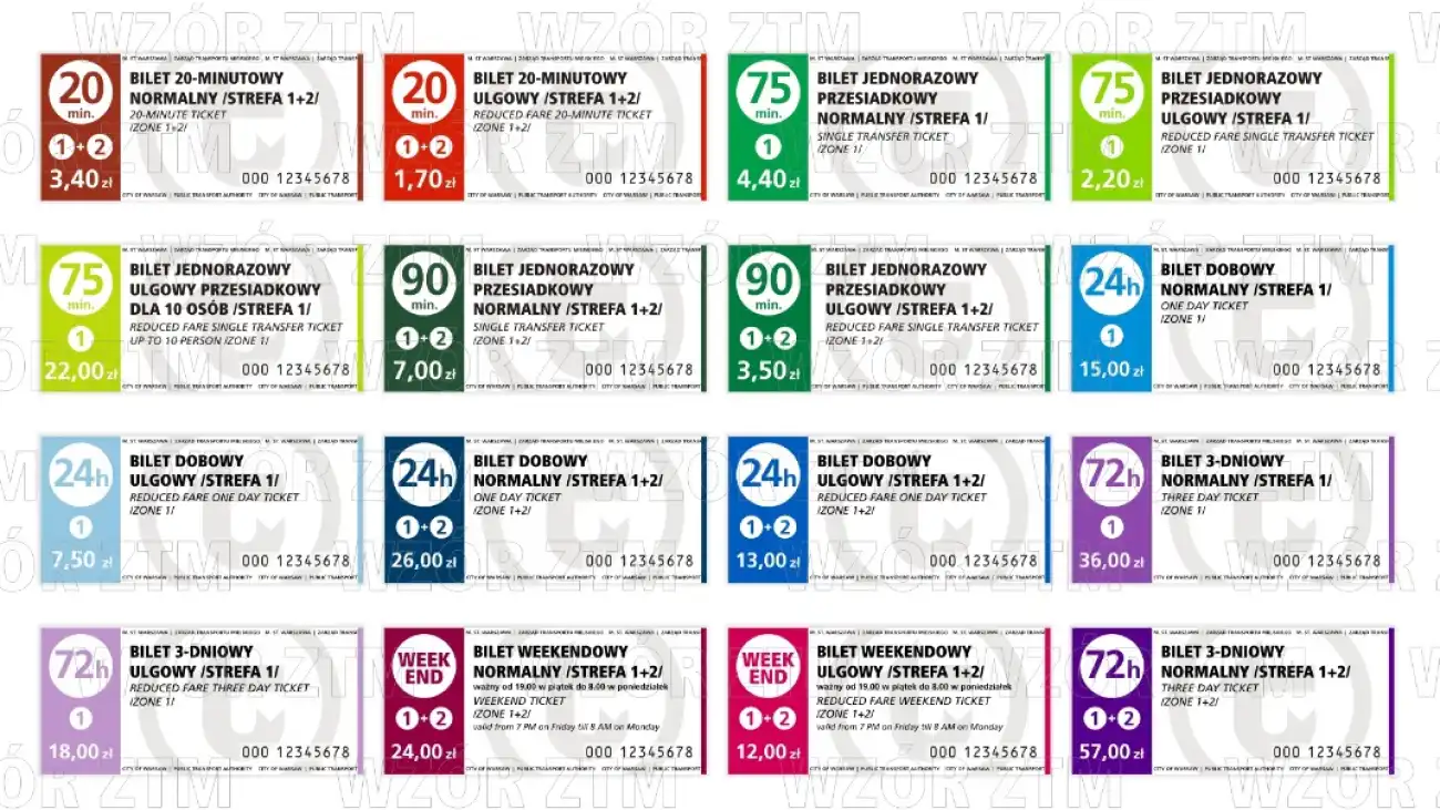 Nowe są wszystkie rodzaje biletów kartonikowych, od 20-minutowego po 3-dniowy, a także bilet weekendowy i wejściówki do metra. Na biletach jest nazwa po polsku i angielsku, cena, informacja o tym, w której strefie komunikacyjnej obowiązują oraz logo Warszawskiego Transportu Publicznego czyli stylizowana litera „t”, przypominająca kształtem warszawską Syrenkę.